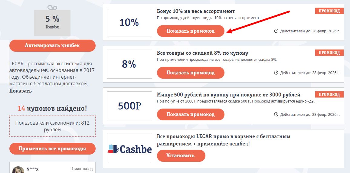 Все промокоды LECAR прямо в корзине с бесплатным расширением + применяйте кешбек!